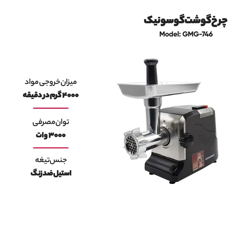 عملکرد معکوس یکی از امکاناتی است که در این چرخ گوشت تعبیه شده است و برای زمانی که گوشت شما در دستگاه گیر می کند بسیار مناسب می باشد یعنی شما می توانید با فعال کردن این حالت گوشت را به طرف بیرون بازگردانی کنید و فرایند چرخ کردن را از اول شروع کنید. چرخ گوشت 3000 وات گوسونیک با این قدرتی که دارد در سریع ترین زمان ممکن و بدون هیچ گونه مکثی هر نوع گوشتی را که بخواهید چرخ می کند و به شما تحویل می دهد. جنس تیغه های این محصول از جنس استیل ضد زنگ میباشد و هر نوع گوشتی را به سرعت ریز و قیمه می کنند. مخاطبان این چرخ گوشت گوسونیک GMG-746 از طریق شفت چرخشی آن می توانند تمام اجزای آن را جدا سازی کنند و شستشو دهند و سپس آن را برای استفاده بعدی دوباره نصب کنند.